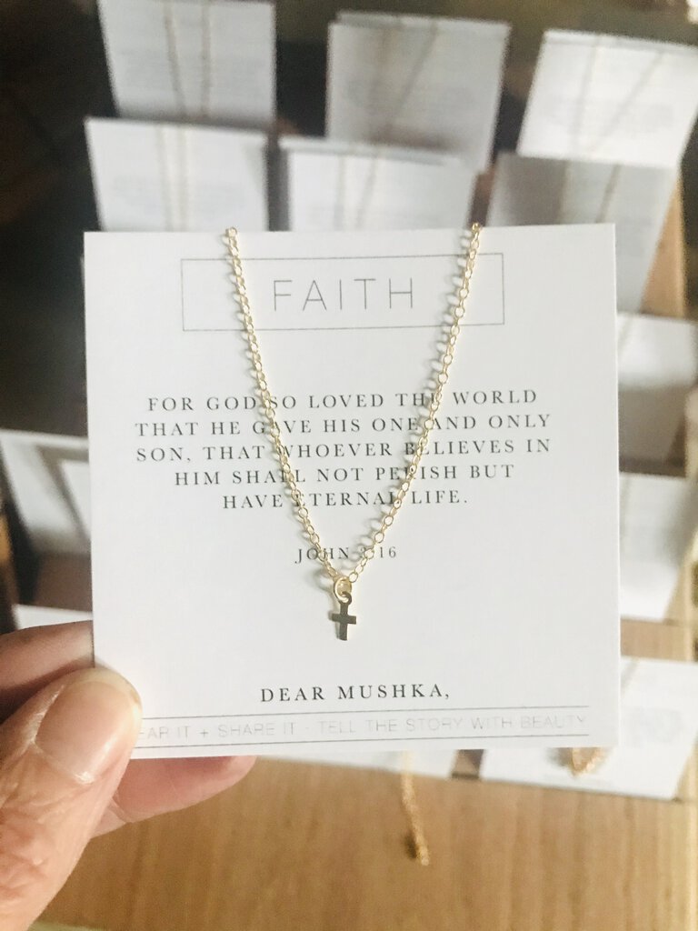 We love this tiny cross pendant, delicately hung on a 16inch 14KT gold fill chain. This length makes it perfect for layering with longer necklaces on adults, but also as a stand alone "first neck;ace" for elementary aged and early teen girls. Packaged on a scripture card feature John 3:16, it provides a wonderful reminder of the true reason we celebrate this Easter. In stock at Plume with immediate Free In-Store Pickup Tuesday - Saturdays. Flat rate shipping $5 anywhere in Missouri. $6 everywhere else in the continental US. Please allow 3-5 business days for your order to be processed and shipped.